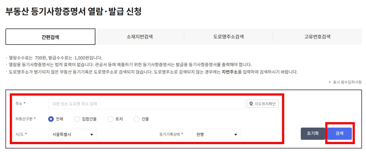 2. '간편 검색' 탭에서 주소, 부동산구분, 시/도, 등기기록상태를 입력한 후 '검색'을 클릭합니다. 호수가 있으면 호수까지 적어주세요(예: 도로명주소 1004호).