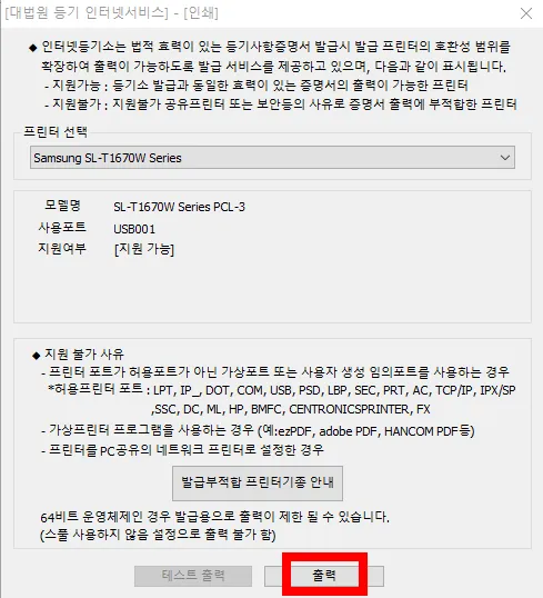 테스트 등기사항 증명서 출력상태를 확인하지 않고 진행하여 비정상 발급된 경우 인터넷 등기소는 제출불가에 대해 책임지지 않으며, 재발급 및 수수료 환불이 불가하다고 하네요.
