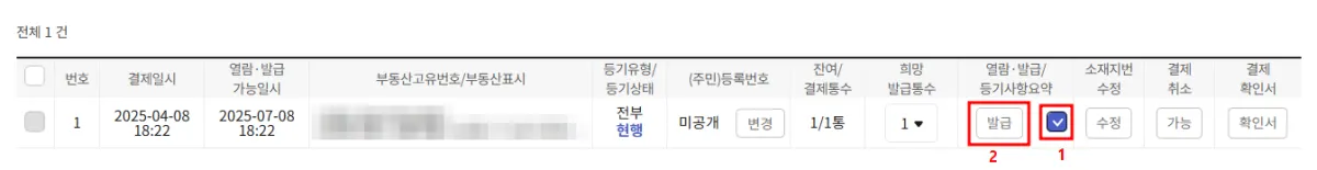 7. 결제가 완료되면 아래와 같은 화면이 뜨는데 '발급' 옆에 박스에 체크하고 '발급'을 눌러주면 됩니다. 뭘 설치하라고 뜨면 설치해 주면 됩니다(www.iros.go.kr의 메시지 팝업창 뜨는 경우).