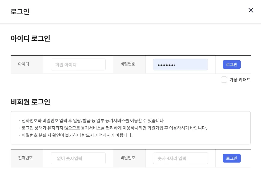 6. 로그인을 합니다. 저는 비회원으로 진행하였어요. 결제는 신용카드, 계좌이체, 선불전자지급수단, 휴대폰결제, 간편 결제 방식으로 가능합니다.