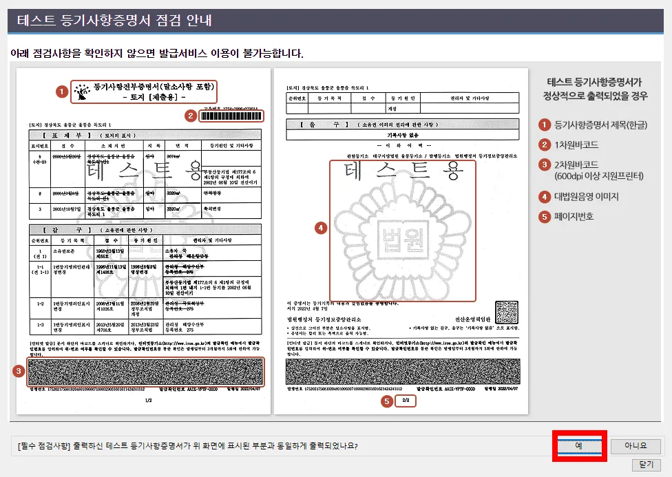 8. '테스트 등기사항증명서 점검 안내' 창이 뜨고 테스트용 서류가 출력되는데 확인 후 '예'를 눌러줍니다.