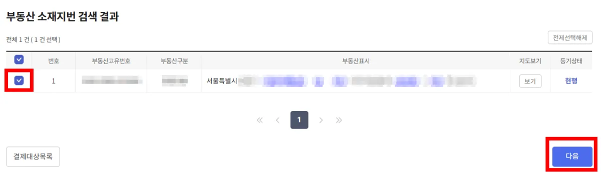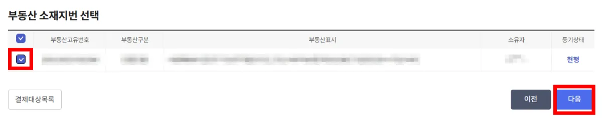 3. '부동산 소재지번 검색 결과'가 나오면 맞는지 확인 후 왼쪽 박스에 체크하고 '다음'을 누릅니다.