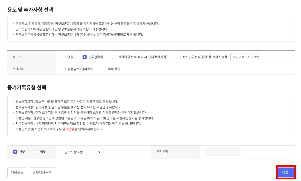 5. '용도 및 추가사항 선택'과 '등록기록유형 선택'을 입력하고 우측 하단에 '다음'을 누릅니다.