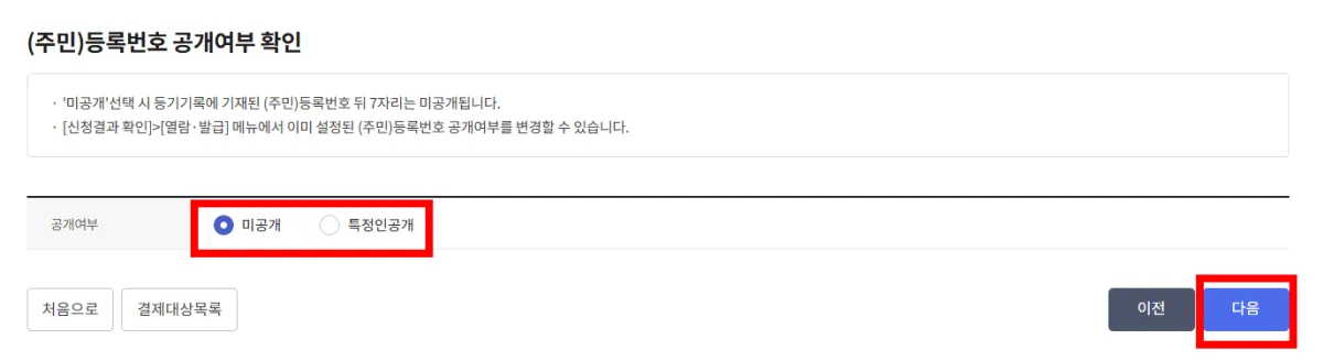 6. (주민)등록번호 공개여부 확인을 선택하고 '다음'을 누릅니다.