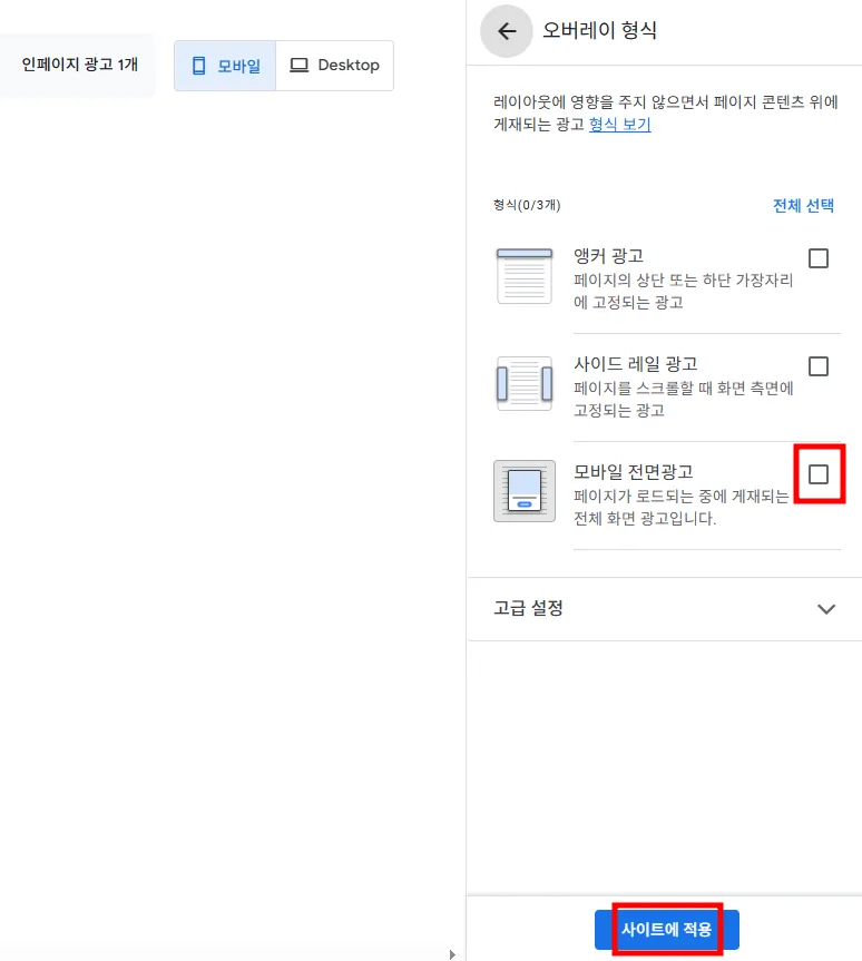 "모바일 전면광고" 박스에 체크를 풀고 밑에 "사이트에 적용"을 눌러줍니다.
