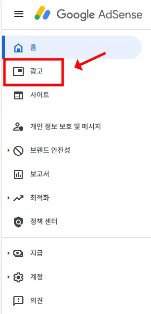 먼저 구글 애드센스 사이트에 로그인해서 왼쪽에 "광고"를 클릭합니다.