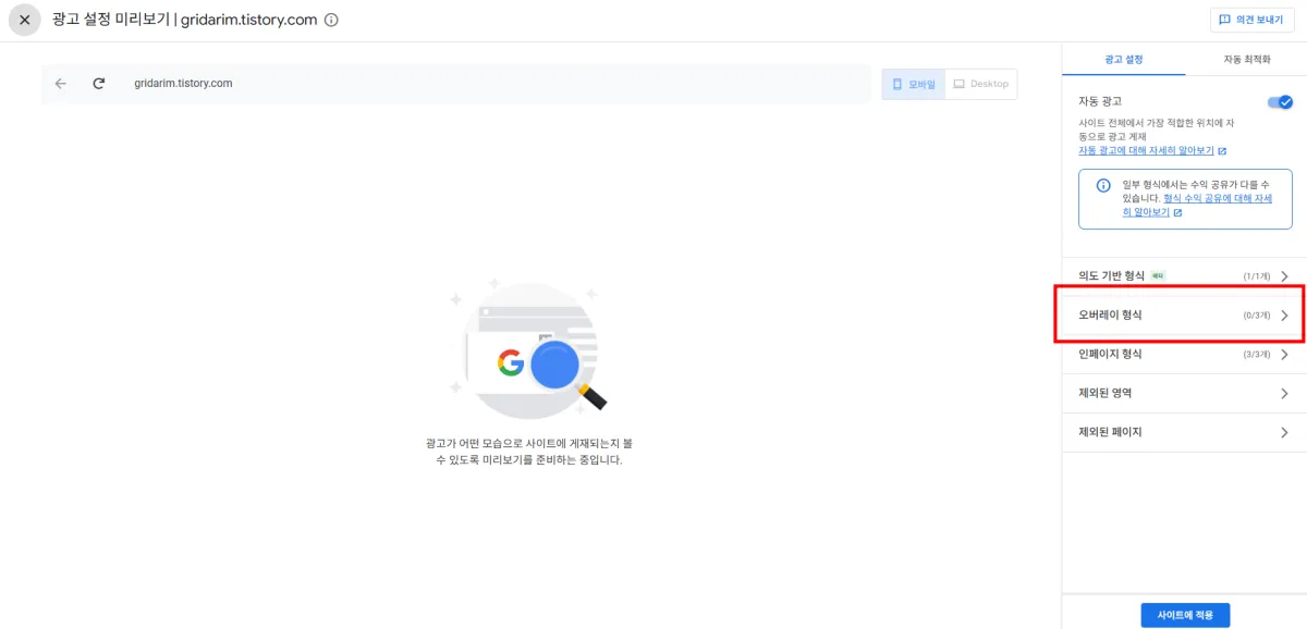 우측 "광고 설정"에서 "오버레이 형식"을 클릭합니다.