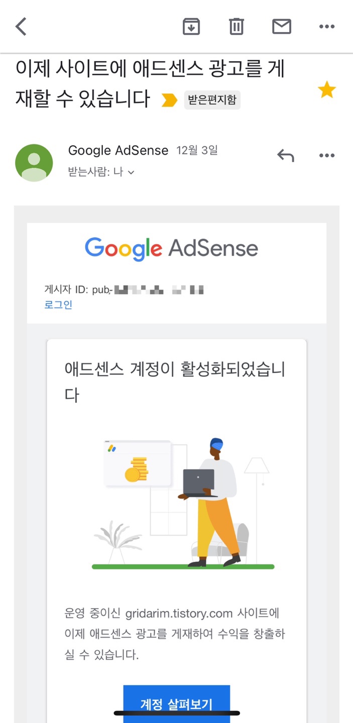 승인 당일인 2021.12.3(금)에 구글애드센스 들어가서 봤을땐,