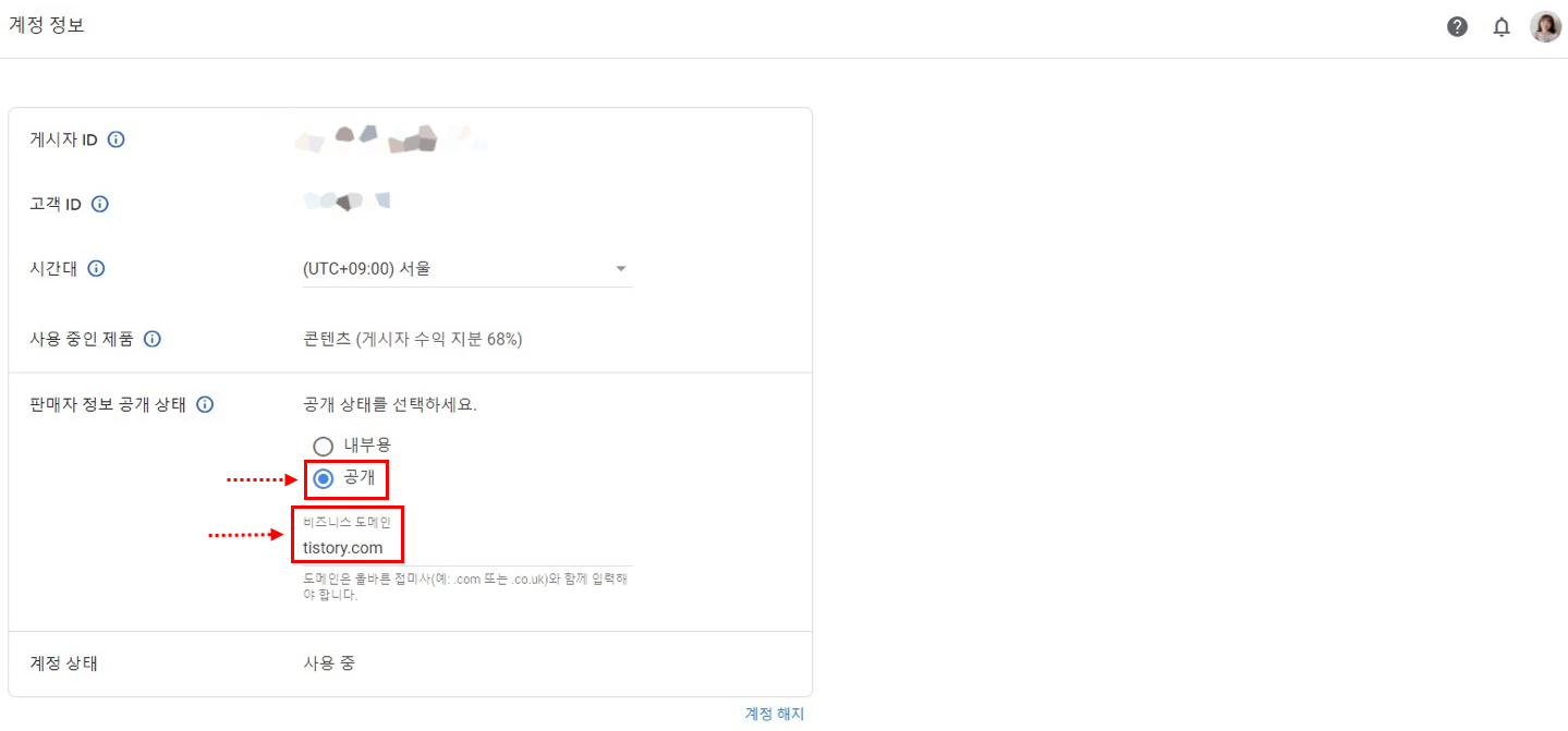 | [요약] 구글 애드센스 웹사이트 접속 후 '작업' 클릭 ▼ 계정 정보 화면에서 판매자 정보 공개 상태를 내부용에서 공개로 변경 및 비즈니스 도메인에 tistory.com기재 |