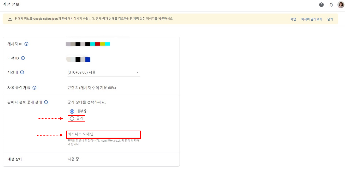 판매자 정보를 Google sellers.json파일에 게시하시기 바랍니다.