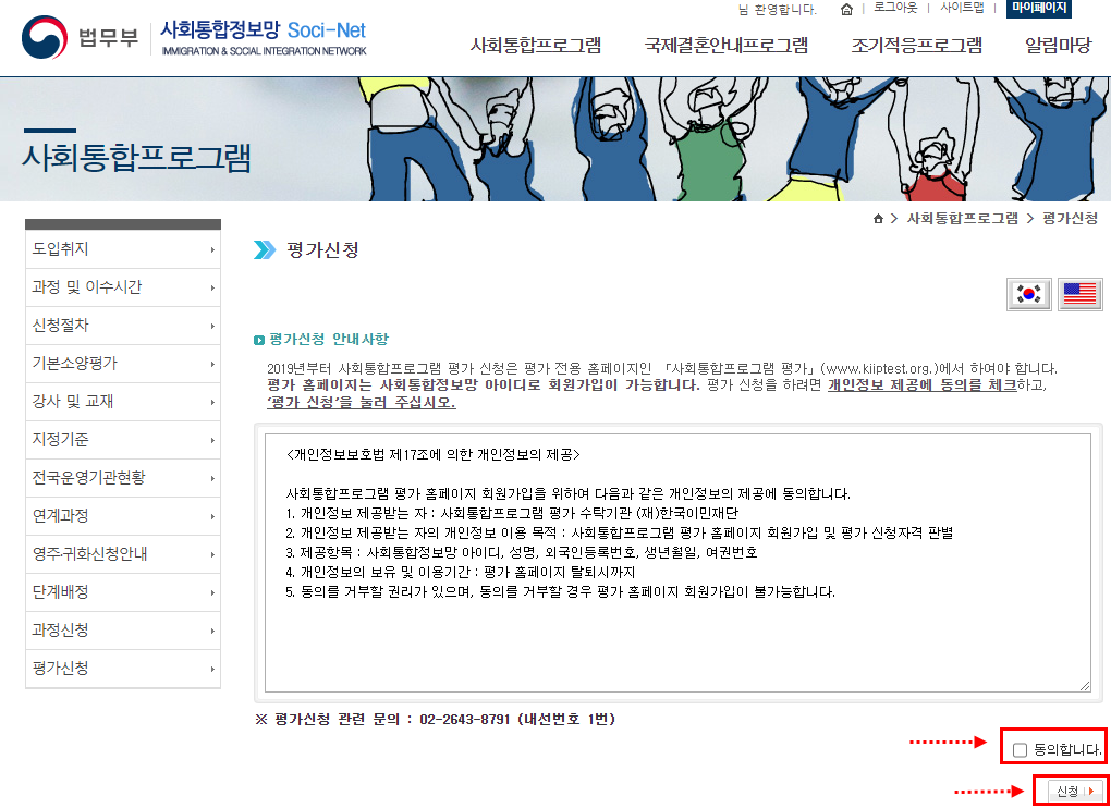 2. 평가신청화면에서 '□동의합니다' 체크후, 그 아래 '신청' 클릭!