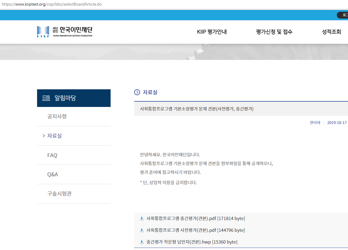 사회통합프로그램(KIIP) 평가 신청방법공지 파일도 있으니