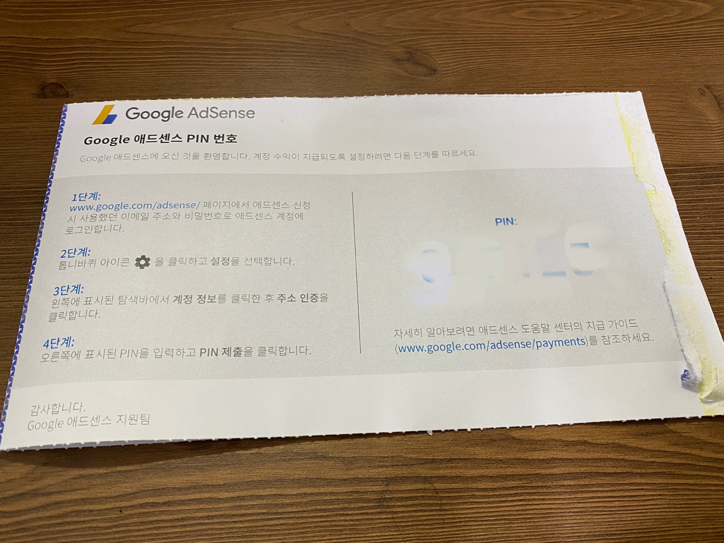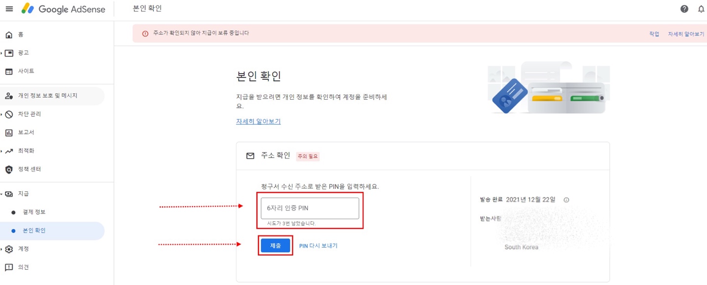 구글 애드센스 핀넘버(PIN번호) 입력 방법