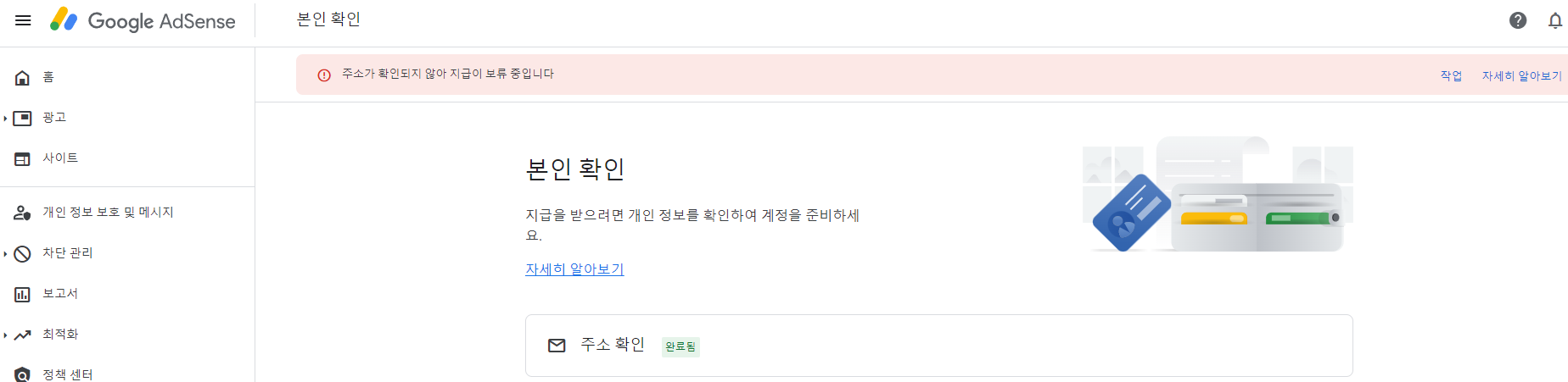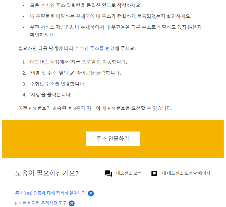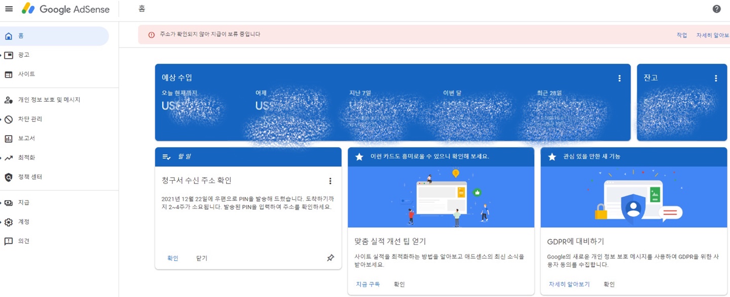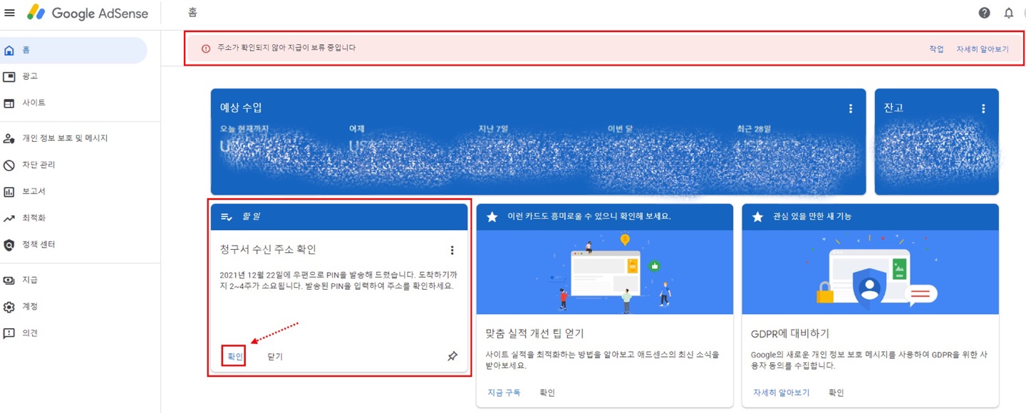 '구글애드센스 사이트에 주소가 확인되지 않아 지급이 보류 중' 메시지 확인: