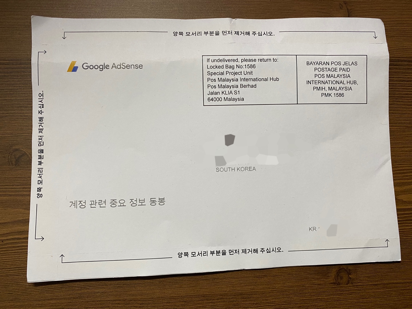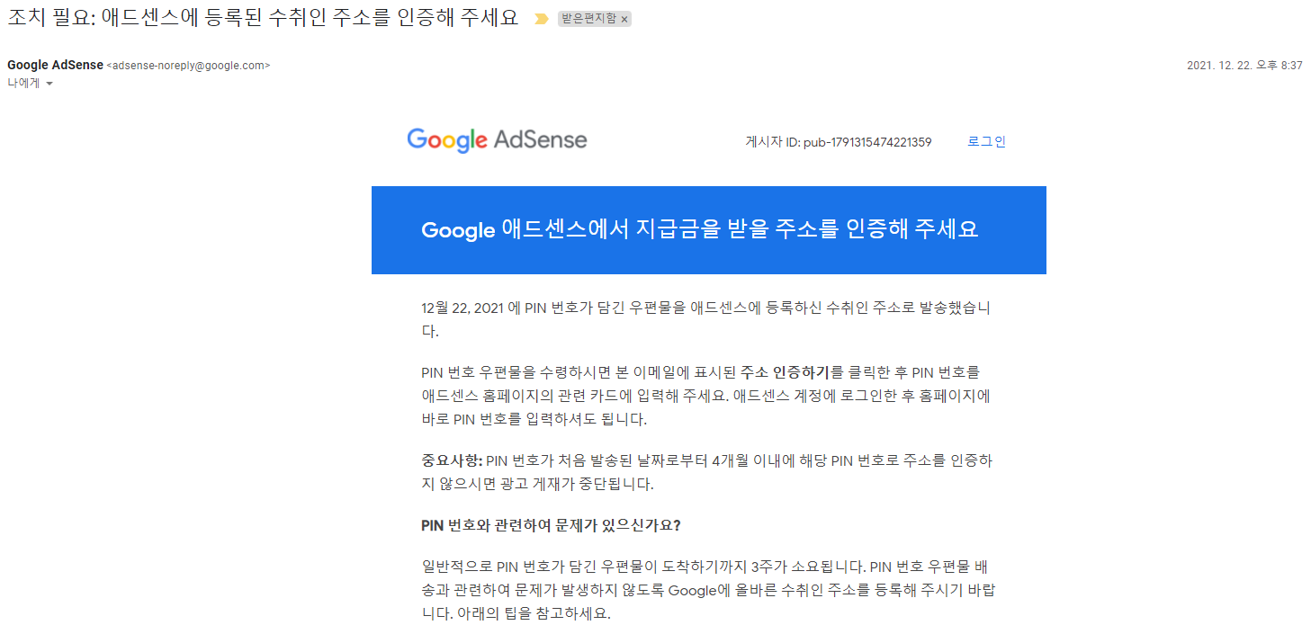 '구글애드센스에 등록된 수취인 주소 인증' 메일 수신 :