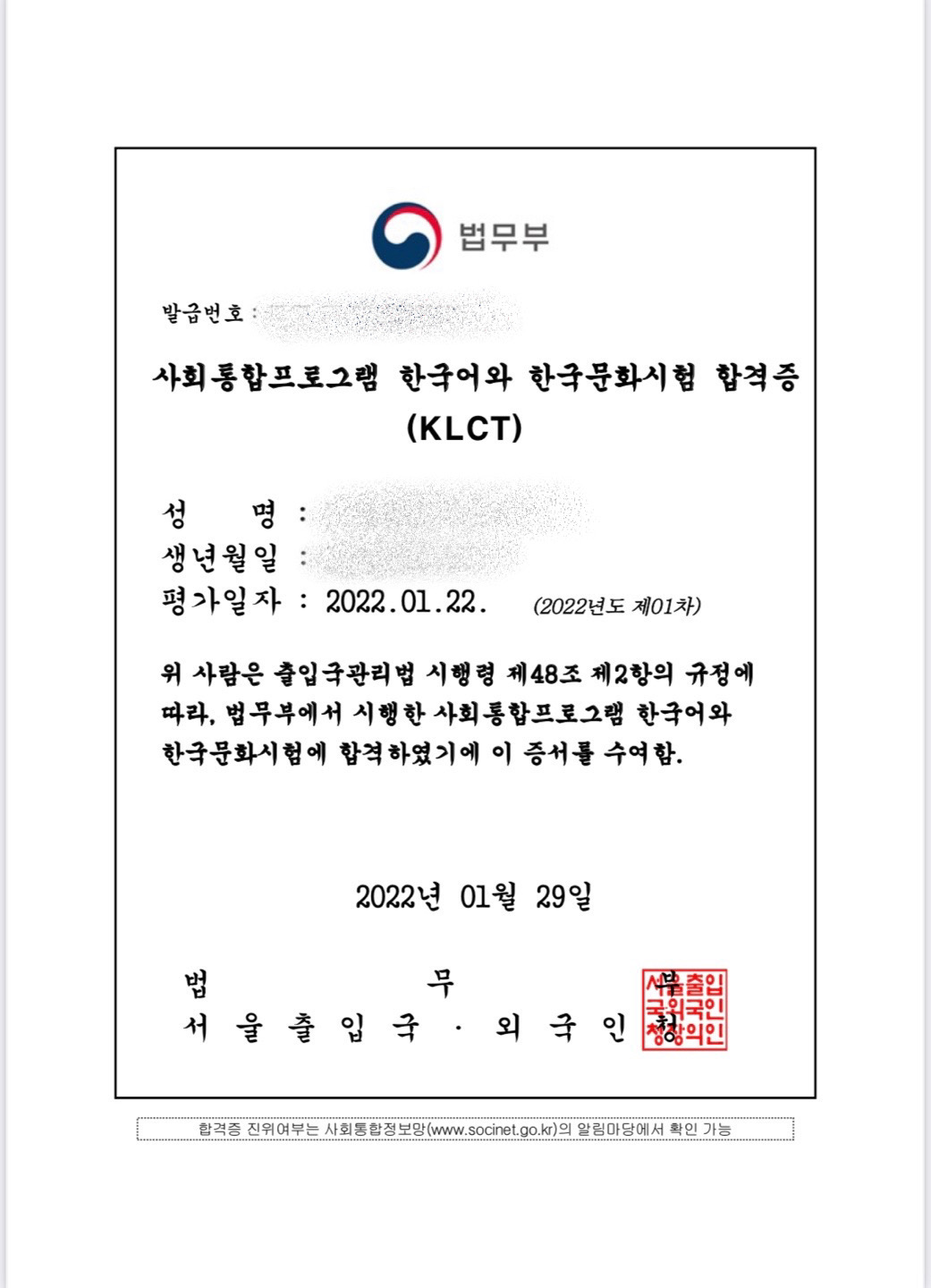 '사회통합프로그램 한국어와 한국문화시험(KLCT) 합격증'