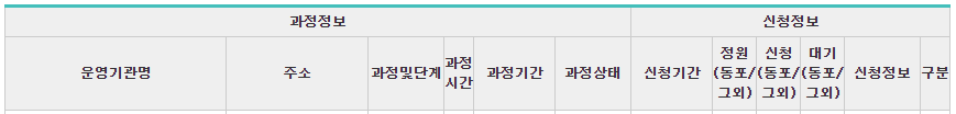 과정및 단계 / 과정시간 / 과정상태(과정시작전, 과정중) / 신청기간 / 신청정보(신청시작전, 대기가능, 신청마감)을