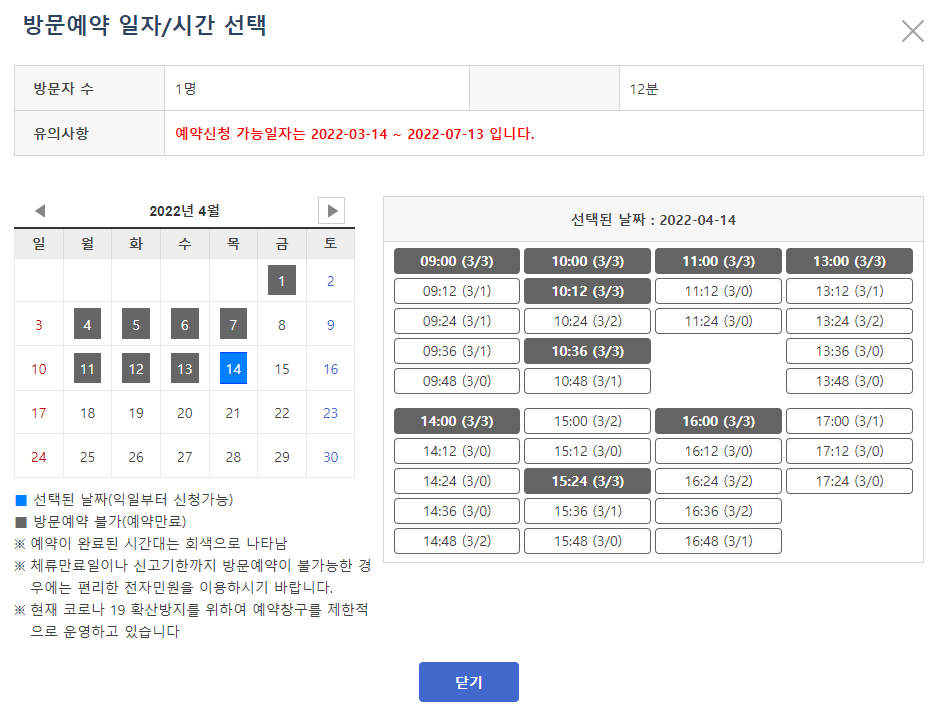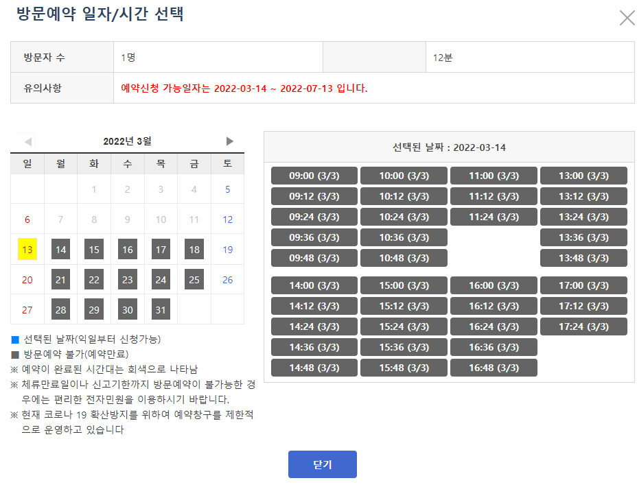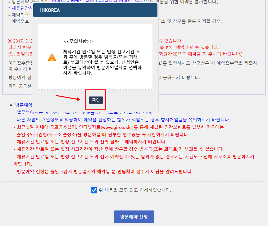 - 체류기간 만료일 또는 법정 신고기간 도과 전의 날짜로 예약하시기 바랍니다.