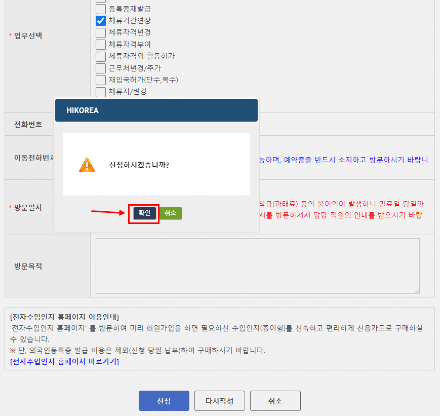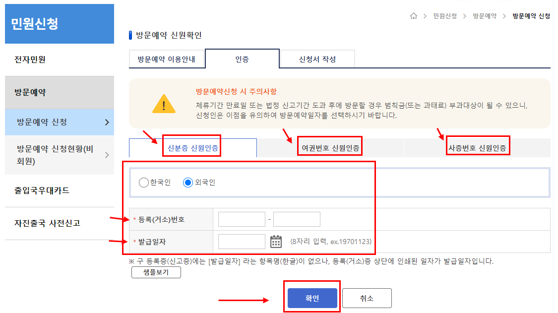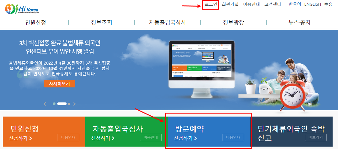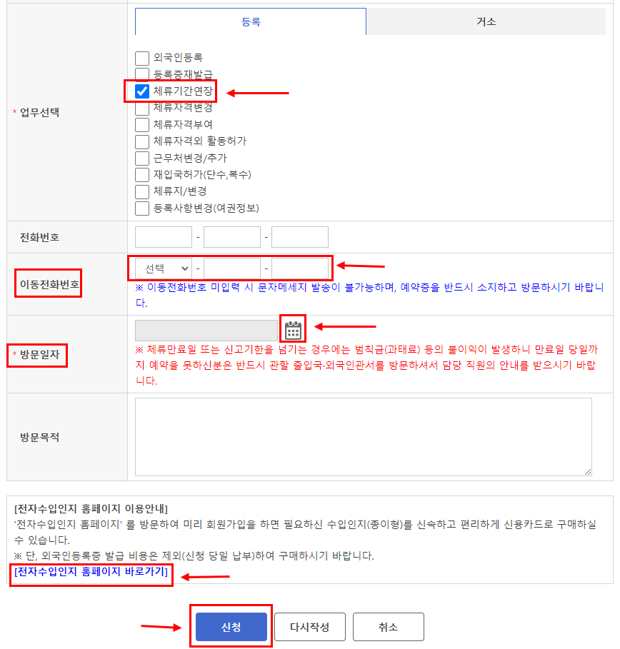 - 방문예약 신청은 출입국관서 방문일자의 예약일 뿐 민원처리 접수가 아님을 알려드립니다.