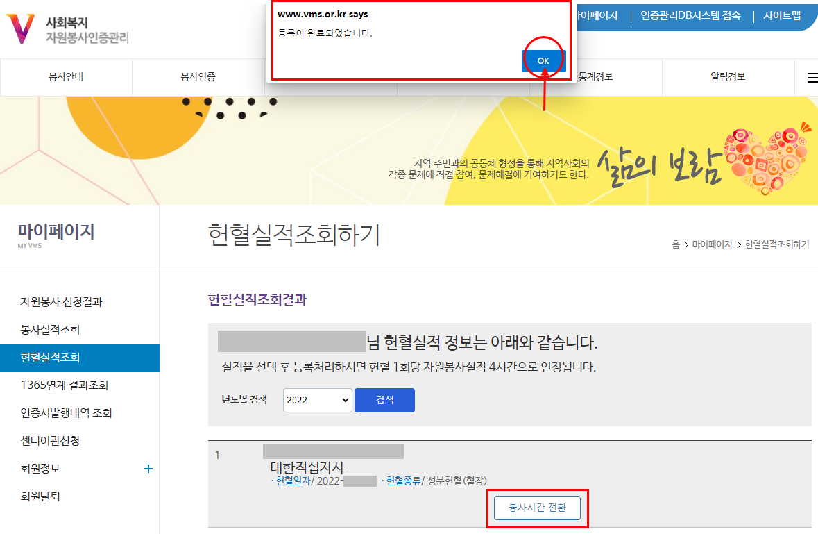 6. 조회된 헌혈 실적 확인 후 하단에 '봉사시간 전환' 클릭 > 상단에 '등록이 완료되었습니다' 팝업창 뜨면 'OK' 클릭 순서로 진행합니다.