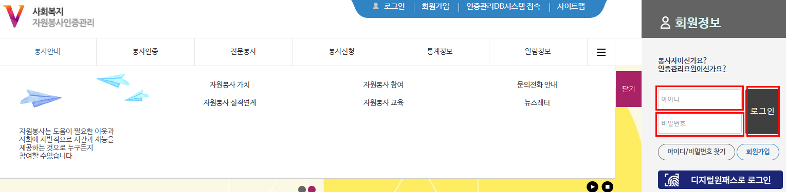 1. 네이버, 다음, 구글 등 웹사이트에서 'VMS사회 봉사 활동인증센터'를 검색하여 웹사이트에 접속합니다.
