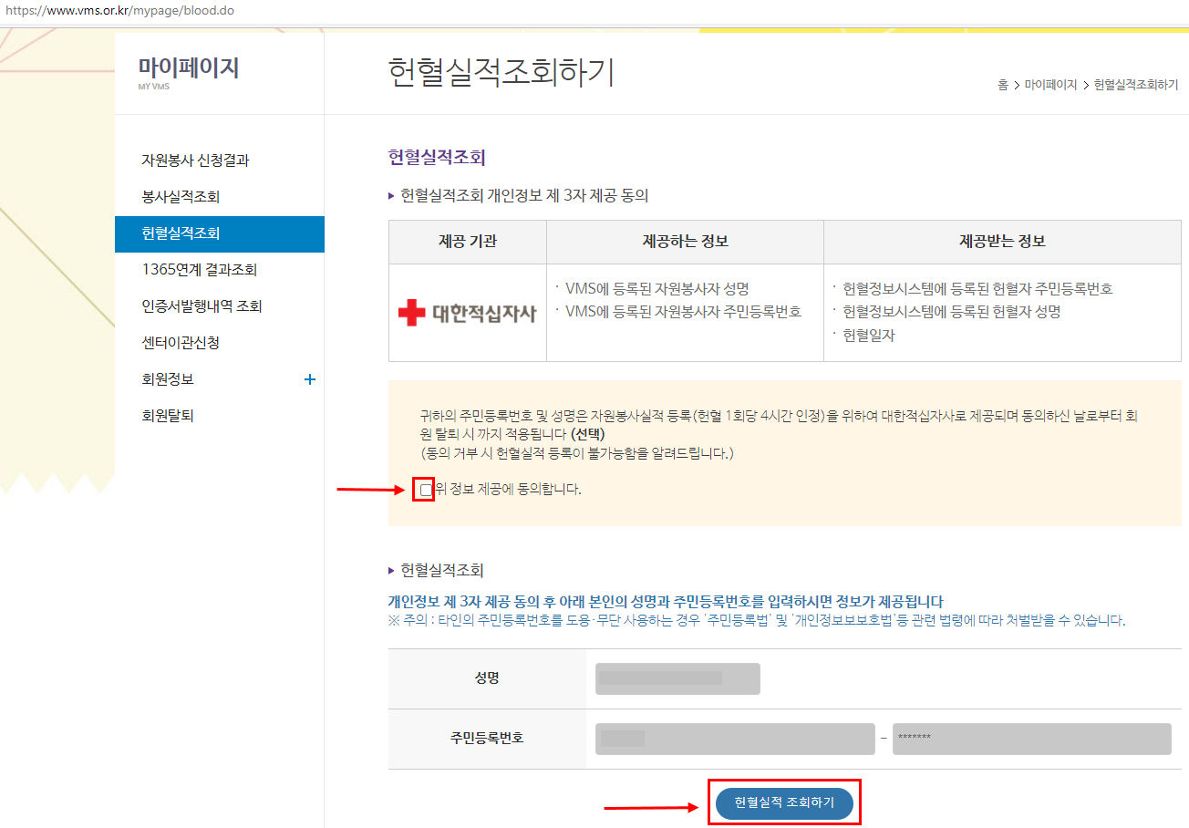 5. 하단에 '헌혈실적 조회하기' 클릭합니다.