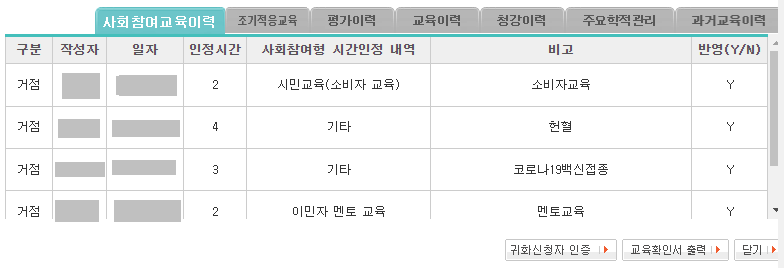 사회참여교육이력 반영 내용은 위 화면에서 '학사이력조회'를 클릭하면 확인 가능합니다.