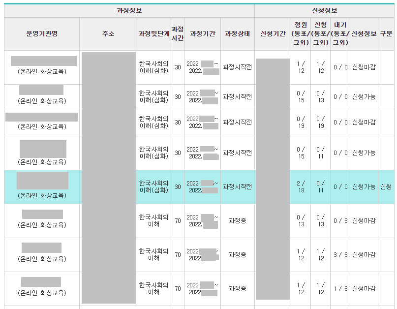 사회통합프로그램 5단계인 한국사회의 이해 기본과 심화과정 신청 화면이 위와 같이 나오는데요. 현재는 코로나19 상황으로 인해 온라인 화상교육으로 진행 중입니다.