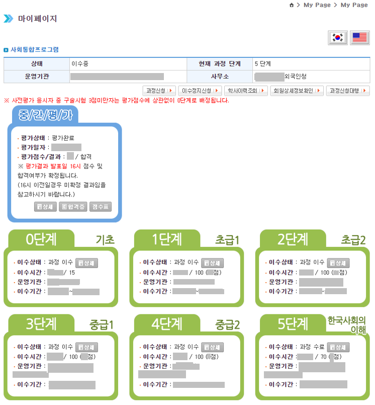 소시넷(사회통합정보망) 웹사이트에서 사회통합프로그램 각 단계별 과정이수 현황과 평가 점수 및 합격 상태를 확인할 수 있는데요.