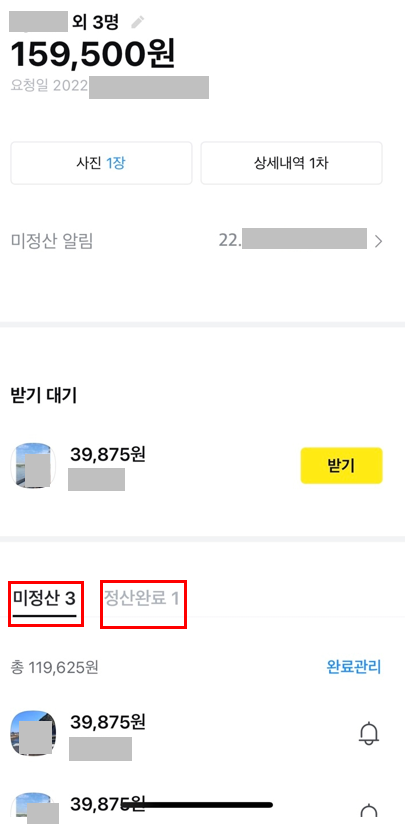 정산현황을 누르면 정산완료한 사람과 미정산한 사람 내용도 확인 가능하고 받기 대기에서 받기를 누르면 금액을 송금받을 수 있어요.