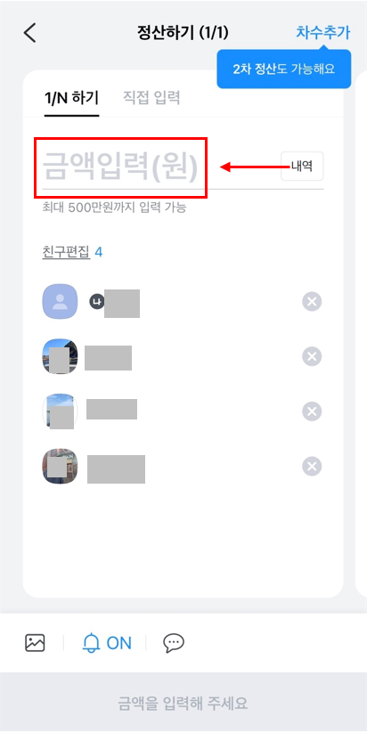 정산할 친구를 확인하고 우측 하단에 1/N정산하기를 눌러줍니다.