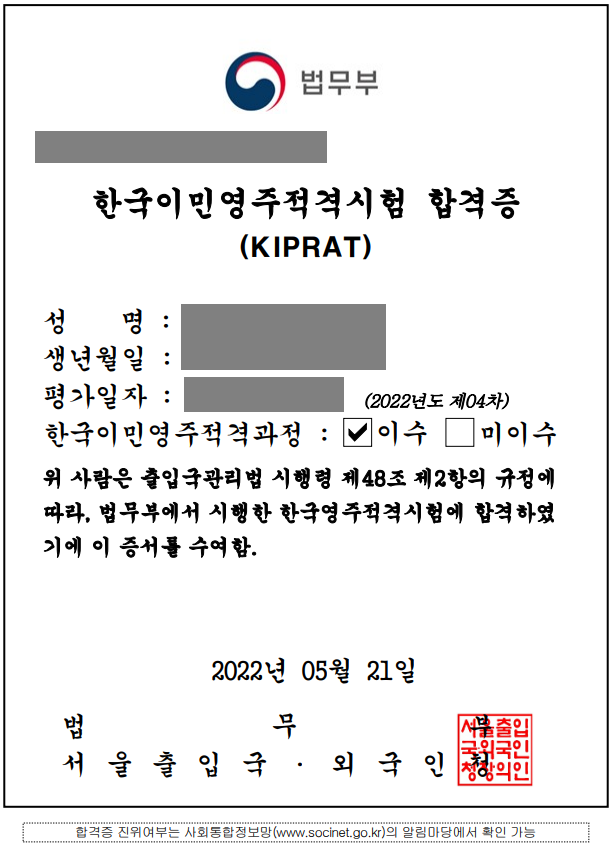 중간평가, 영주용 종합평가, 귀화용 종합평가까지 합격하고