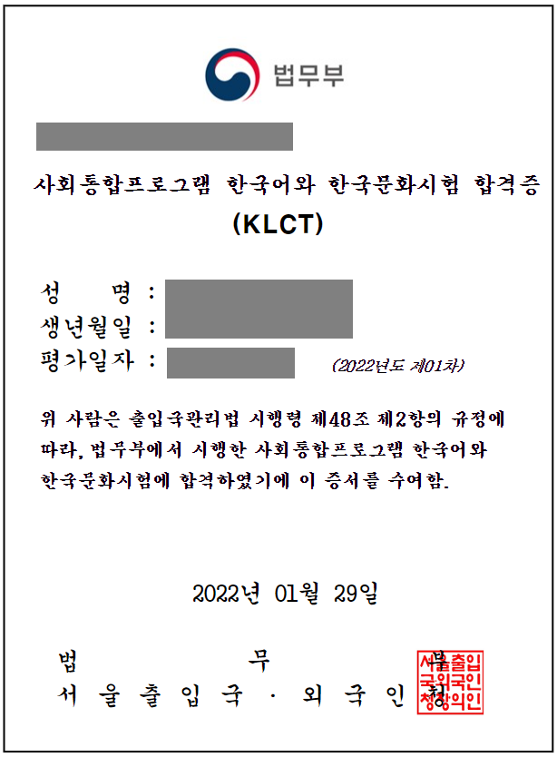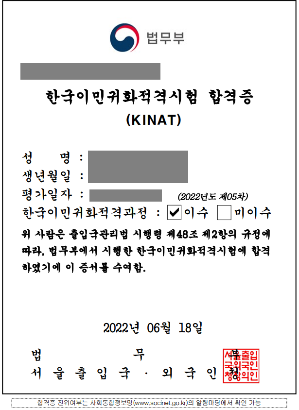 사회통합프로그램 5단계 '귀화용 종합평가'를 합격 후