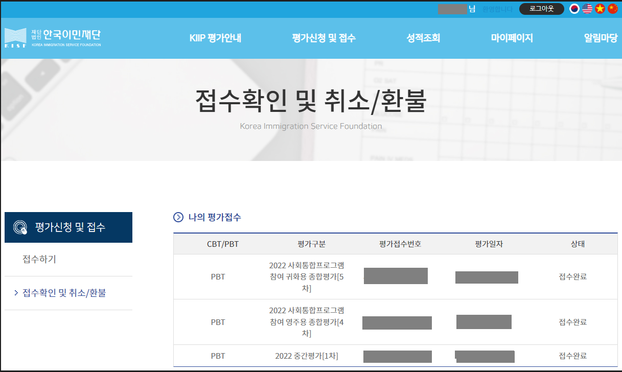 사회통합정보망 웹사이트 로그인 후 '평가신청' 메뉴와 연결된 평가 홈페이지에서 하여야 함.